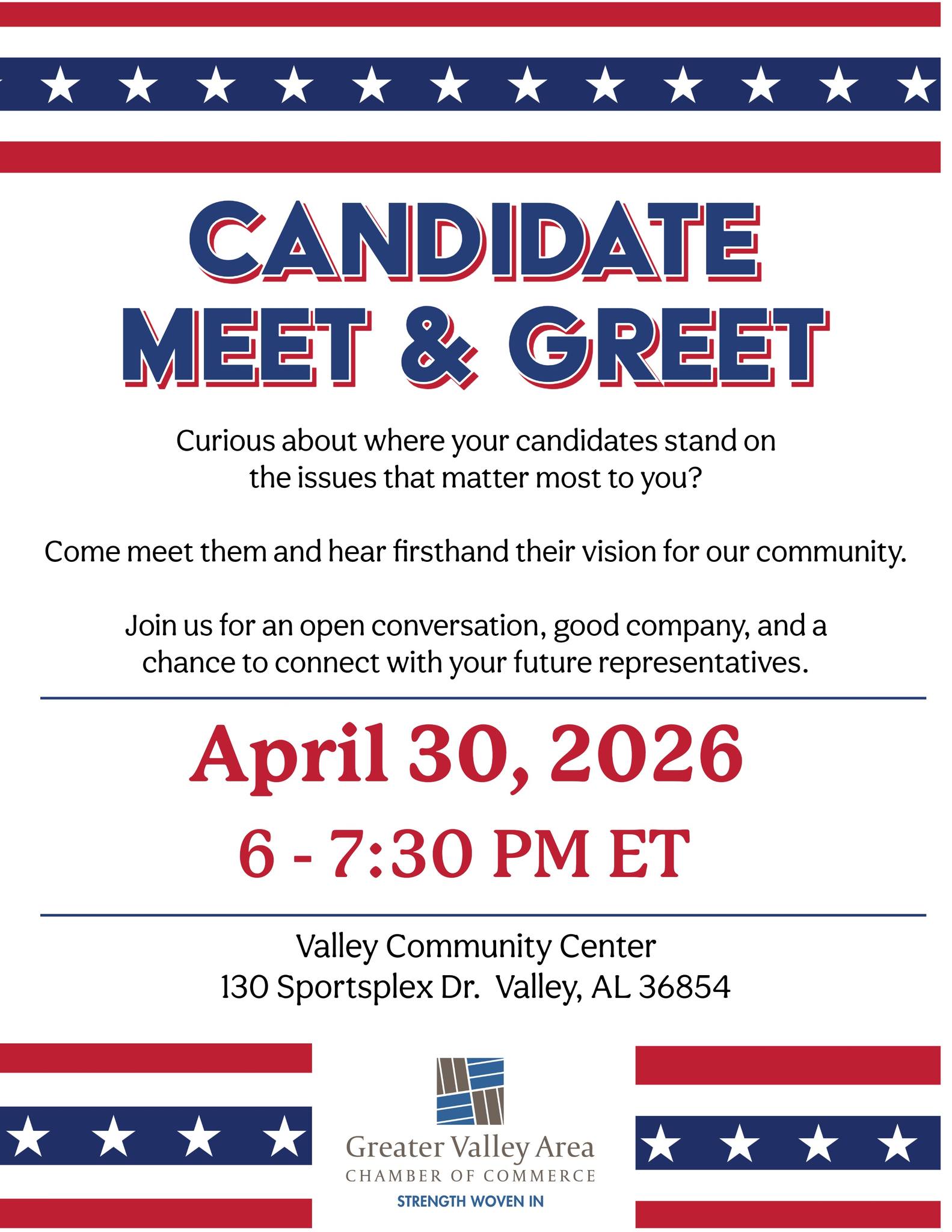 Curious about where your candidates stand on the issues that matter most to you? The Greater Valley Area Chamber of Commerce will host a Candidate Meet & Greet on Thursday April 30th, 2026 beginning at 5:30 pm EST. from the Valley Comminity Center located at 130 Sportplex Dr, in Valley.