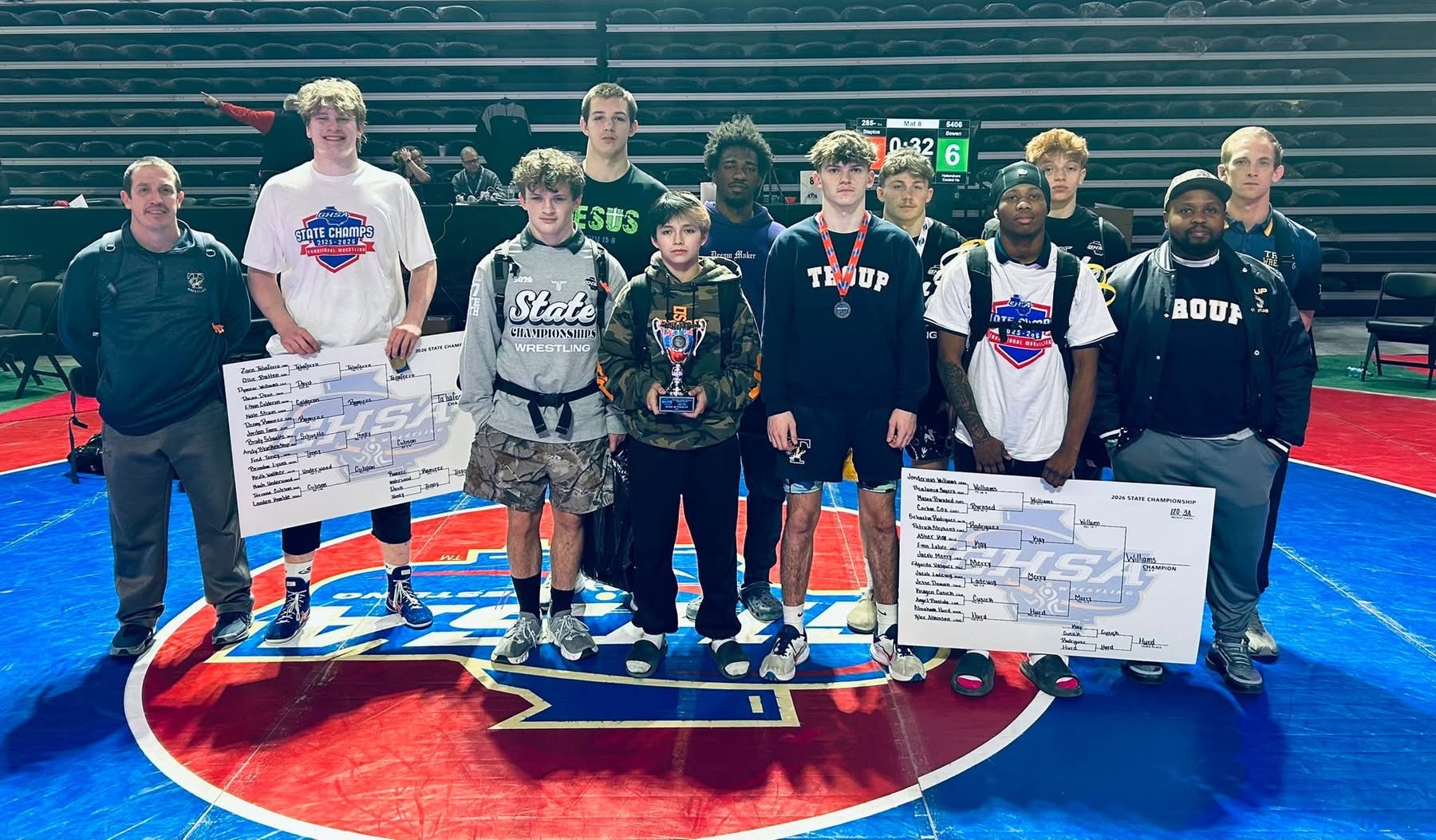 Troup also had 4 wrestlers also make it to the podium- State Runner up – Preston Strickland with a hard fought finals match. Noah King fought back through consolation placing 3rd along with Hank Muhr placing 4th and Braylon Smith placing 6th! Carson Vaillant, just returning from injury took a tough loss in the blood rounds as well as Anthony Swanson after battling tough in their 5th matches of the day. Kam Huzzie also showed great determination and grit in a tough bracket. Troup also took home 2nd place in total overall points behind Jefferson. Huge accomplishments by all of our wrestlers and coaches!