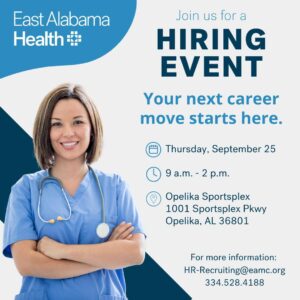 EAMC is excited hosting our first Hiring Event at the Opelika Sportsplex on Thursday, September 25th from 9:00 am- 2:00 pm.