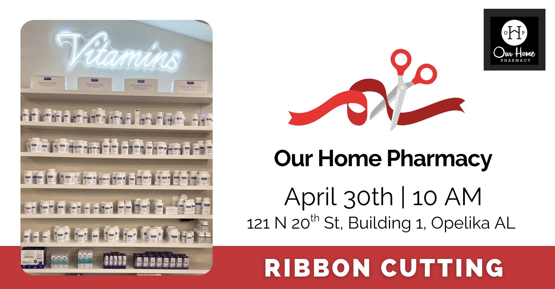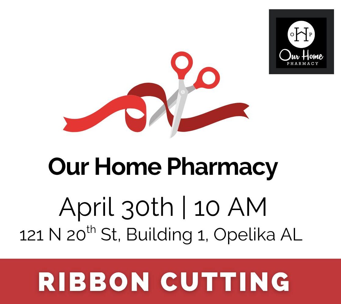 Join the Opelika Chamber for the ribbon cutting of Our Home Pharmacy on April 30th at 10 AM. Our Home Pharmacy is committed to staying up-to-date with the latest in medications, vitamins, over-the-counter products, and treatments while also offering a curated selection of gifts and coffee!
