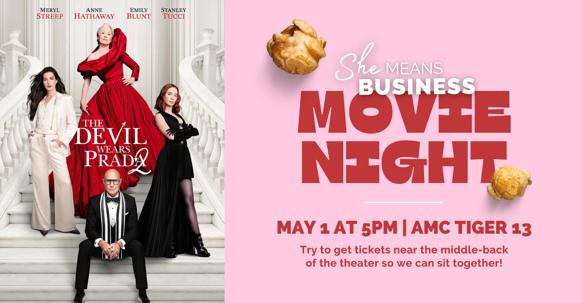 A night of popcorn, iconic fashion moments, and connecting with fellow women in business. When you purchase your own tickets, try to get seats in the back middle rows so we can all sit near each other.