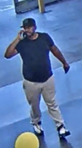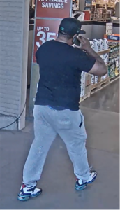 Surveillance video shows a black male with facial hair wearing a black hat, black t-shirt, gray pants, and Nike Air Ken Griffey Max 1 shoes.
