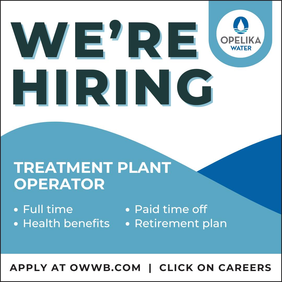 Opelika Water is hiring for Treatment Plant Operator, where you will collect water samples for testing, aid other employees in water purification and perform minor building and grounds maintenance and repair while training for certification; as well as perform directly related work as required. Full-time work with benefits, paid time off and more! Learn more or apply today.