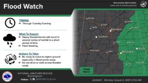According to the National Weather Service and the Chambers EMA, thunderstorms with heavy rainfall remain possible today and tomorrow across mainly eastern and southeastern Central Alabama. Slow movement, combined with high rainfall rates, may cause flash flooding, particularly in areas prone to flooding.