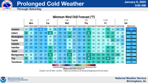 According to the Chambers County EMA, we can expect prolonged cold weather this week ahead of the winter potential on Friday. Wind chills may remain below freezing each day even as air temperatures reach the low 40s.  A forecast for wind chills is also attached.