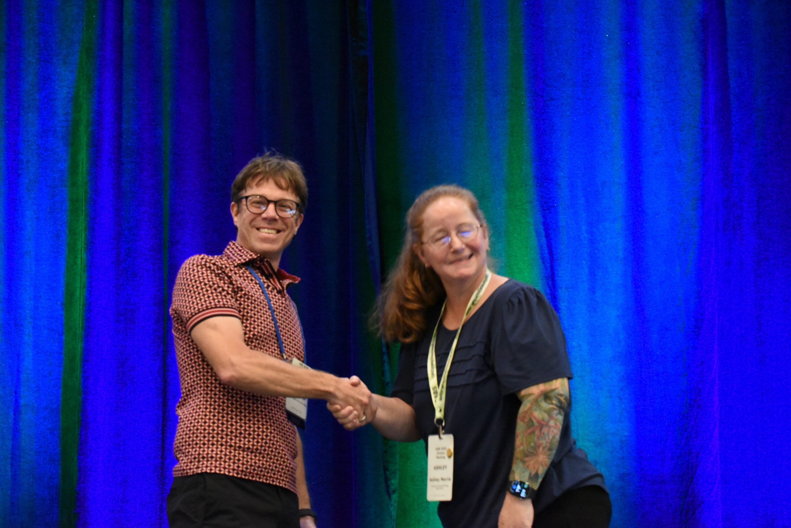 Photo Caption: Above Dr. Barger is congratulated on his award by Ashley Morris of Furman University