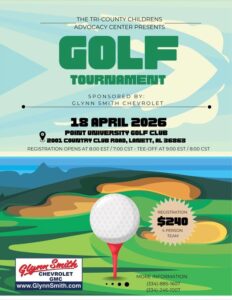 Tri-County Children’s Advocacy, in partnership with Glynn Smith Chevrolet, will host the annual golf tournament at the Point University Golf Club in Lanett on April 18th, 2026.