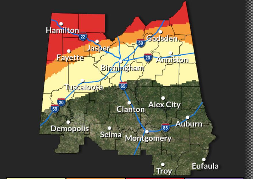 In East Alabama, rain is expected to occur mainly from today through Sunday, which may lead to issues with black ice for travel late Sunday night and into Monday morning. There is a slight possibility that light rain could transition to freezing rain or a mix of rain and snow as temperatures drop significantly before the rain ends, particularly from Sunday night into Monday morning. Expect temperatures to plummet from 50°F to 23°F, and wind chill will make it feel even colder. The high on Monday is expected to be 39°F, with a low of 16°F, which increases the risk of black ice on Sunday night and Monday morning.